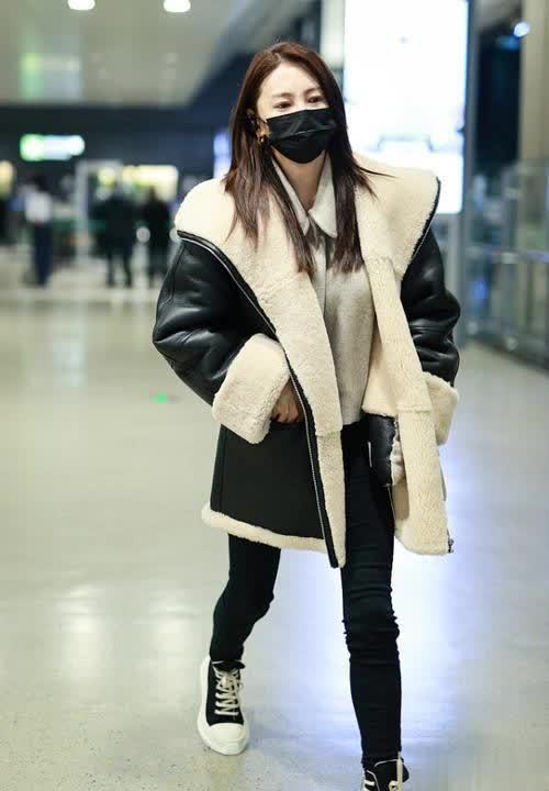 皮外套外层是黑面料,但里边的毛毛十分吸睛,保暖效果跟羽绒服不相上下。腿上是黑色修身裤,比较显腿细。