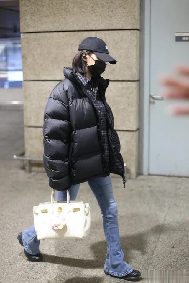 时髦精们穿羽绒服时,常常会选牛仔裤做下装,腿上裤子整体修身,脚踝往下松量能多些,因此,这条裤子适合腿细的姐妹。