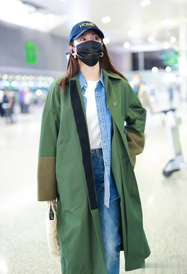 绿大衣在人群中是亮眼的存在,这件大衣长度在小腿肚处,比较挑身高,一米六以上的女生驾驭起来更容易些。里边是蓝色衬衫,它和大衣的门襟都是敞开的,进而让最里边的白内搭呈现出来,光是上半身,就至少有三个颜色。之所以如此说,是因为大衣之上还能看到黑色和浅棕色面料。腿上穿的牛仔裤刚好与衬衫颜色相呼应,这样一来,整体穿搭在颜色上就不会太多。